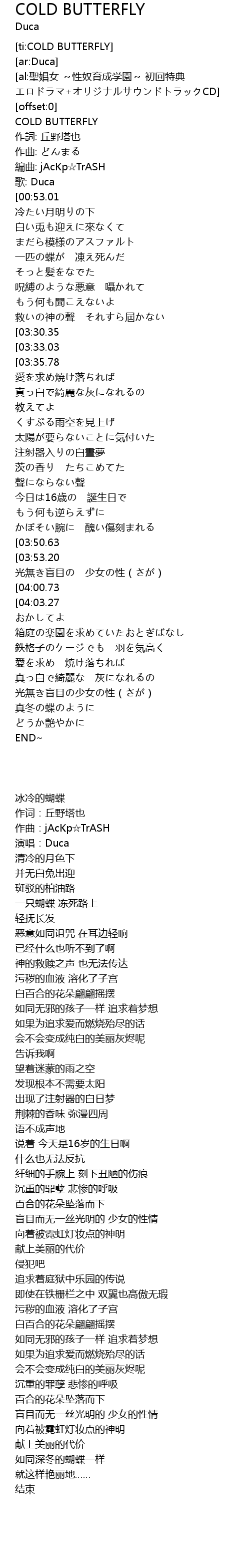 | [00:46.93] | 一匹の蝶が 凍え死んだ |