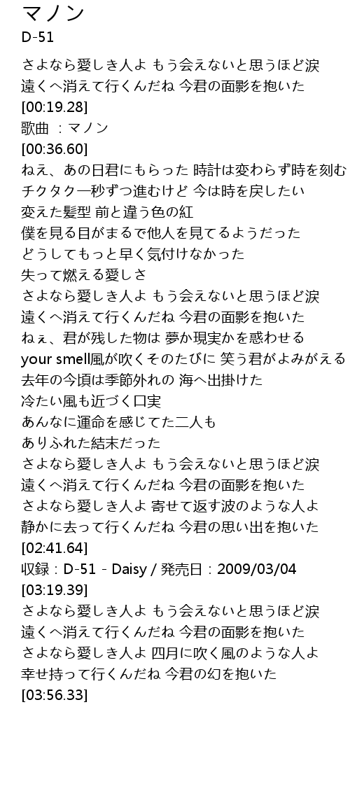 | [00:21.28] | 歌曲 :マノン |
