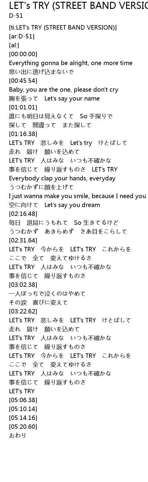 | [04:02.17] | LET's TRY 悲しみを LET's TRY けとばして |