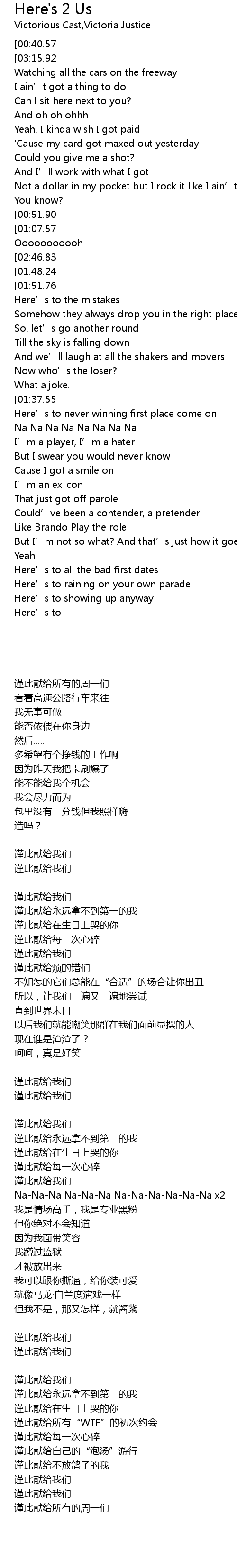 | [00:47.55][01:07.57][01:35.63][01:55.64][02:38.25][03:10.51] | Here' s to us |