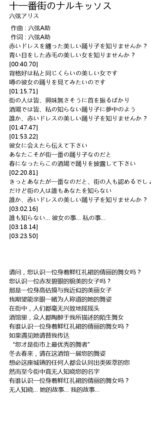 | [01:36.75] | 誰か、赤いドレスの美しい踊り子を知りませんか? |