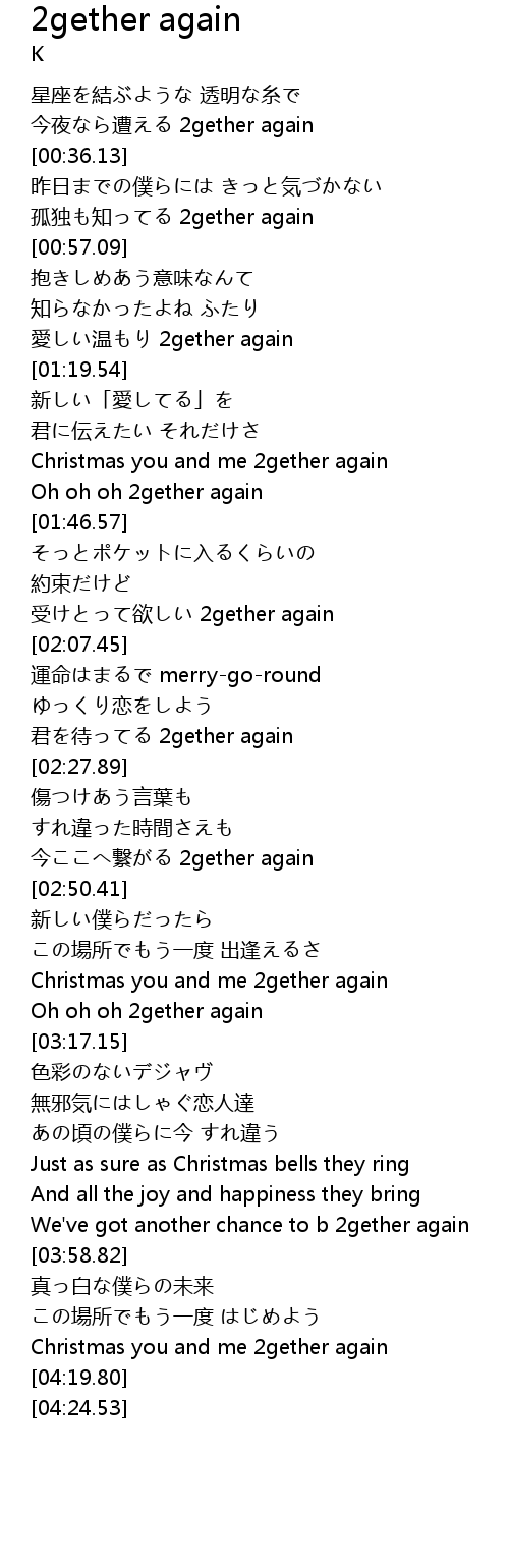 | [01:58.56] | 受けとって欲しい 2gether again |