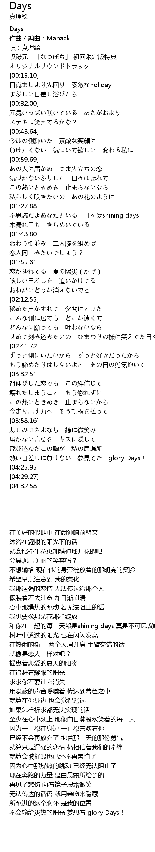 | [04:17.78] | 熱い日差しに負けない 夢見てた glory Days! |