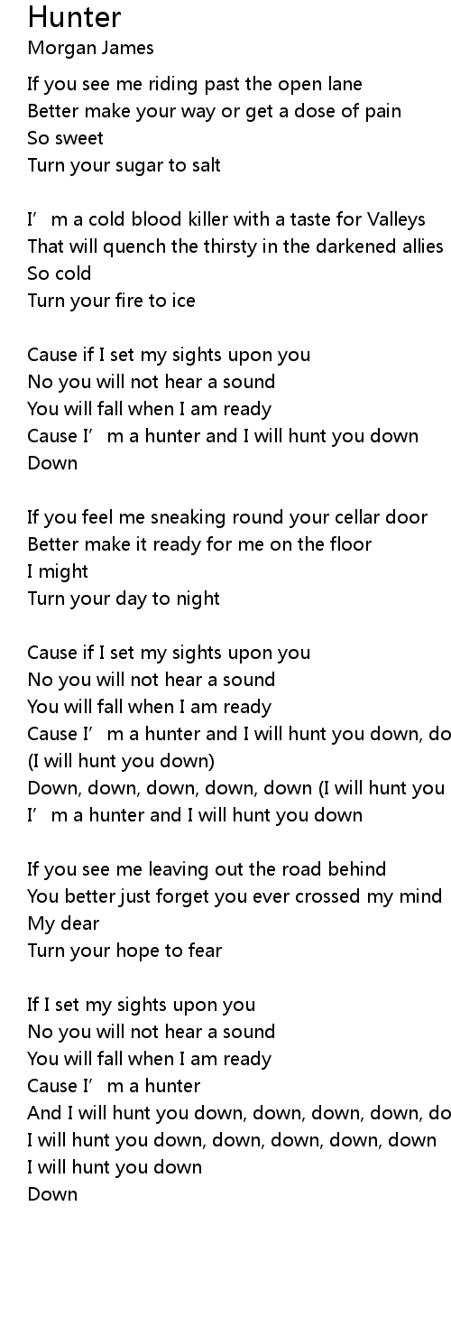 | [02:12:00] | Cause I’m a hunter and I will hunt you down, down, down, down, down (I will hunt you down) |