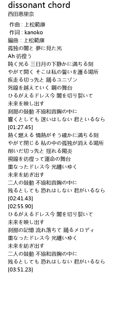 | [03:23.59] | 重なったドレス今 光纏いゆく |