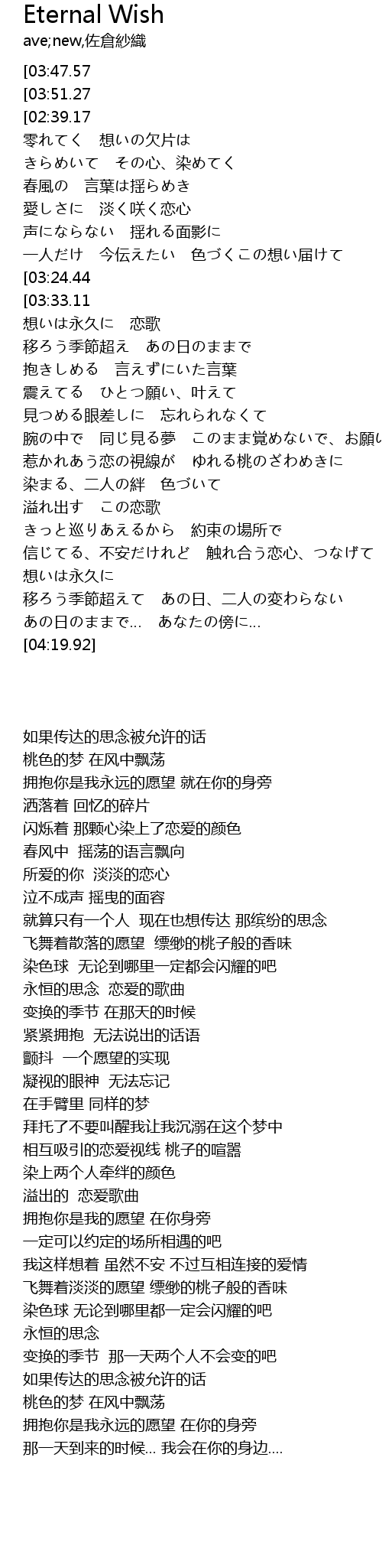 | [00:26.13][02:39.17][03:54.43] | 永久の願い抱きしめ あなたの傍に |