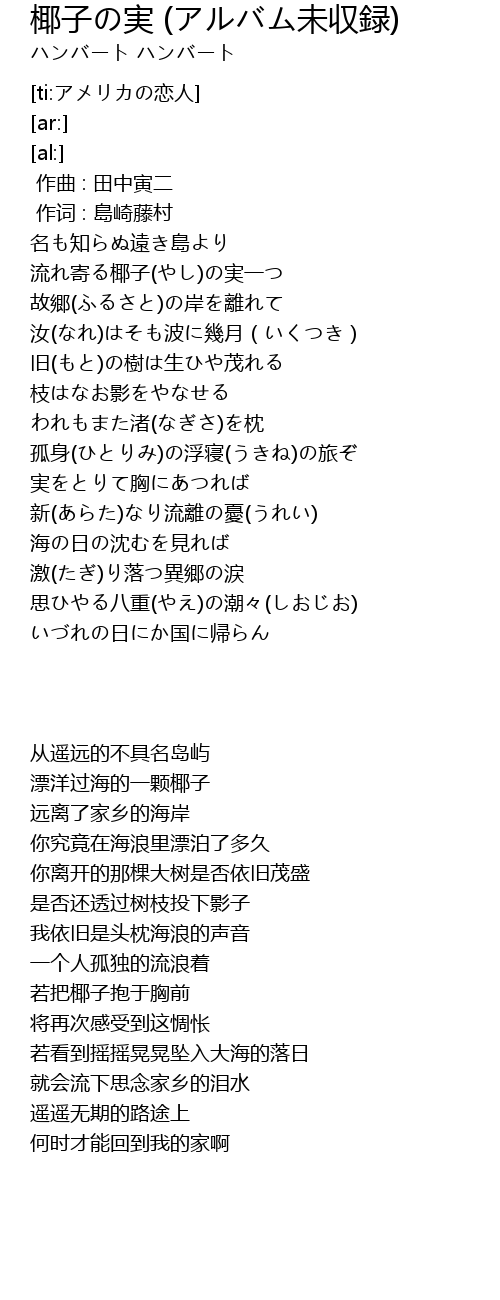 | [00:20.58] | 流れ寄る椰子(やし)の実一つ |