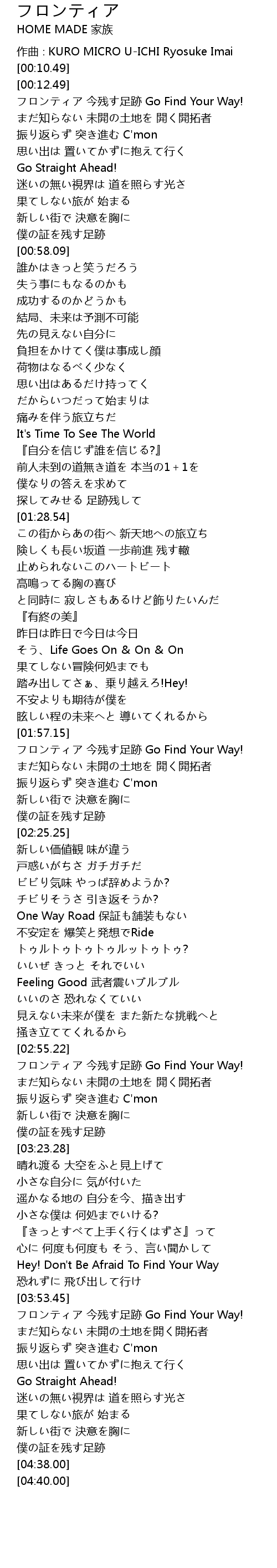 | [02:55.94] | フロンティア 今残す足跡 Go Find Your Way! |