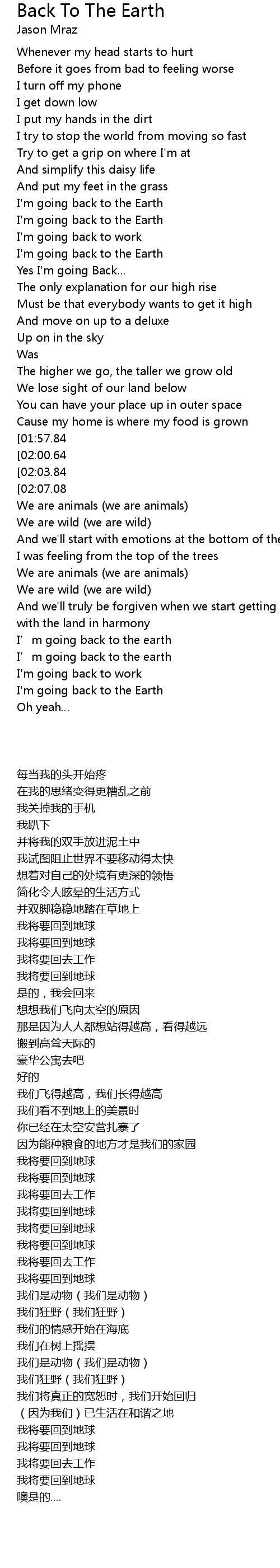 | [02:13.22][02:00.64] | I' m going back to the Earth |