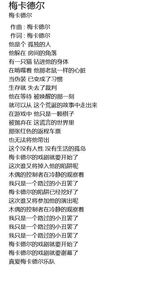| [00:01.00] | 作词 : 梅卡德尔 |