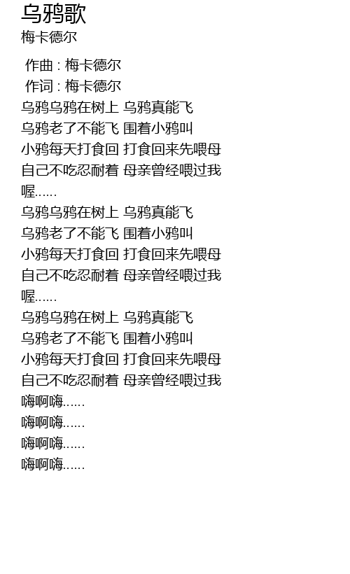 | [04:19.76] | 乌鸦乌鸦在树上 乌鸦真能飞 |