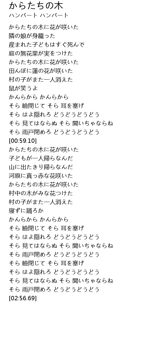 | [00:15.04] | からたちの木に花が咲いた |
