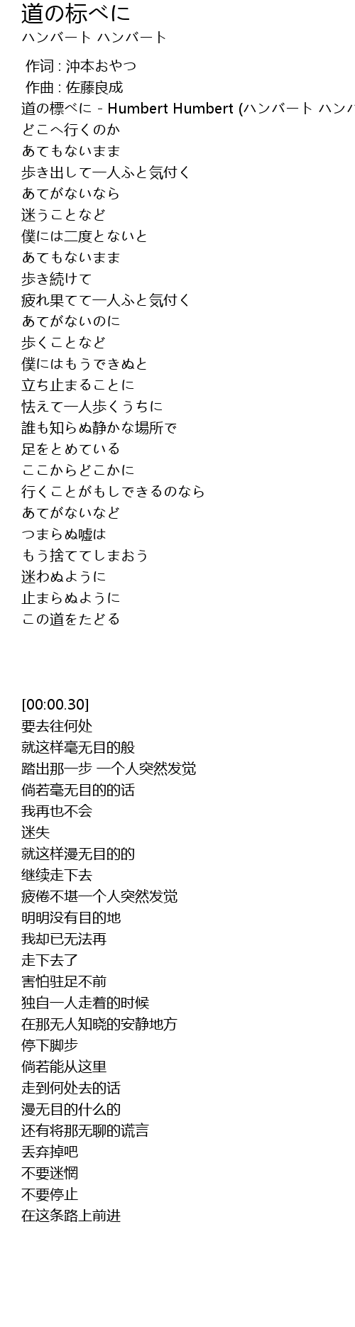 | [00:00.30] | 道の標べに - Humbert Humbert (ハンバート ハンバート) |