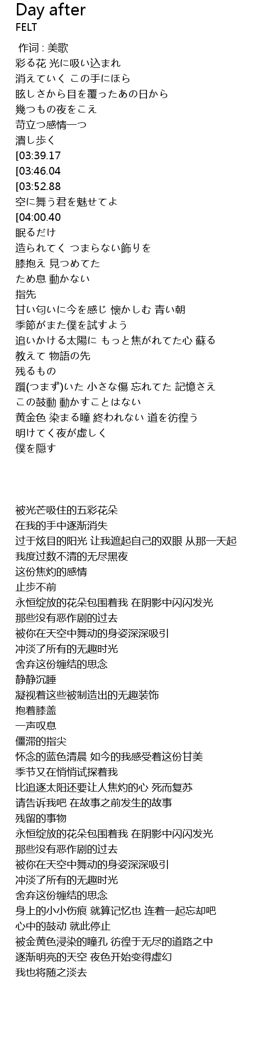 | [01:21.94][03:39.17] | 枯れない花に包まれ 影の中 輝くの |