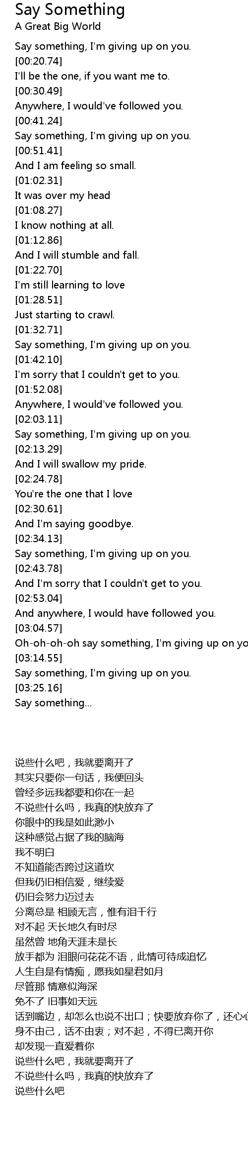 [00:17.68] Say something, I'm giving up on you.