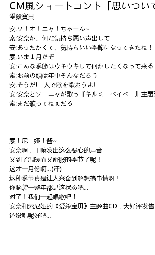 | [00:20.357] | 安:安奈とソーニャが歌う『キルミーベイベー』主題歌CD、大絶賛発売中!イェーイ! |
