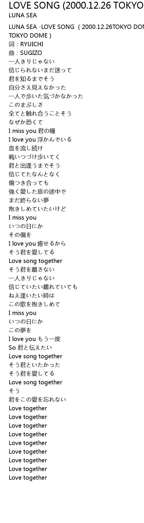 | [00:00.62] | LUNA SEA LOVE SONG 2000. 12. 26TOKYO DOME LUNA SEA THE FINAL ACT TOKYO DOME |