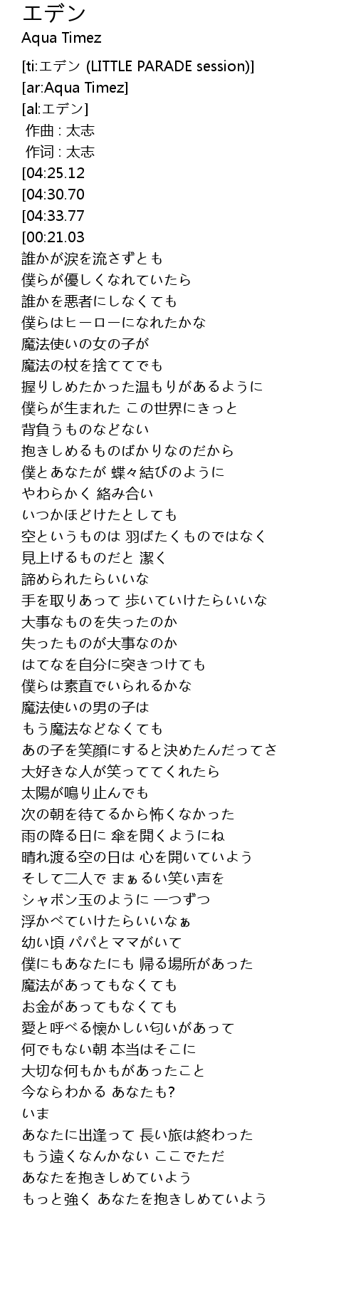 | [00:15.29][00:21.03][01:20.38][01:54.16][03:17.06][04:23.87][04:58.05] | |