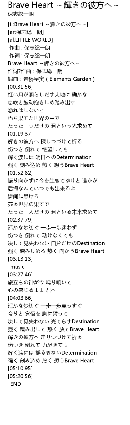 | [00:01.20] | Brave Heart ~辉きの彼方へ~ |