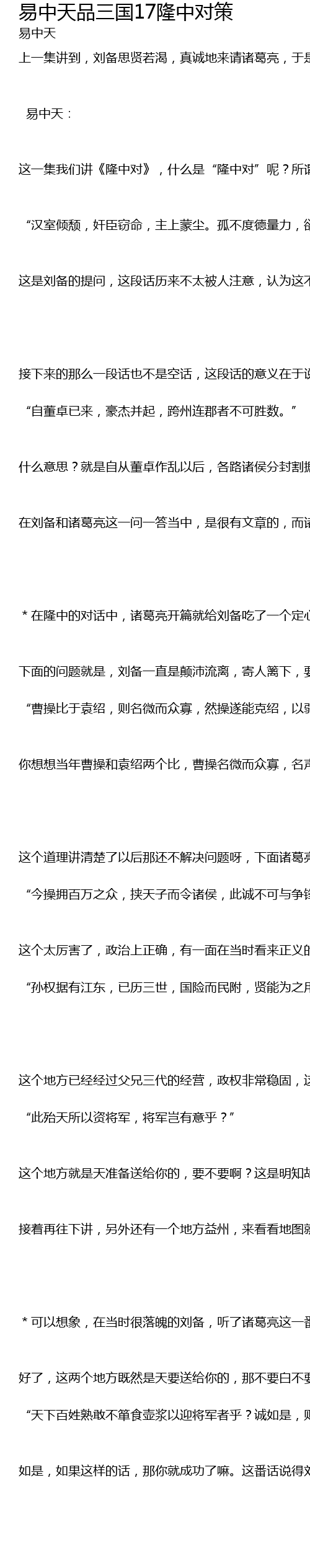 | 这一集我们讲《隆中对》,什么是“隆中对”呢?所谓“隆中对”实际上是刘备和诸葛亮在隆中的一次密谈,《三国志》说得很清楚:“因屏人曰”,也就是把其他的闲杂人等,甚至我估计连关羽、张飞都离开了那个密室,只有刘备和诸葛亮两个人谈,刘备就提了一个问题,刘备说: | |