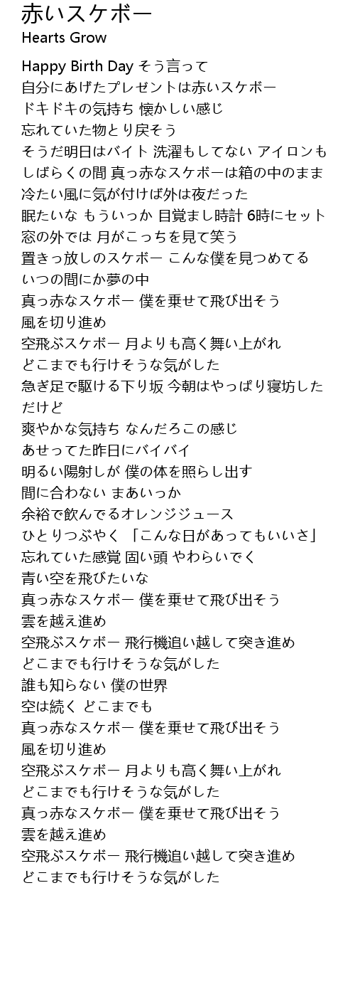 | [00:15.50] | Happy Birth Day そう言って 自分にあげたプレゼントは赤いスケボー |