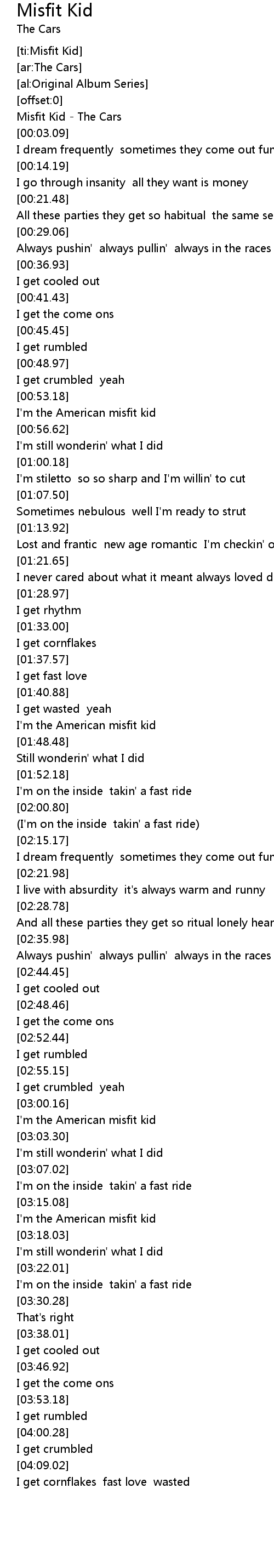 [00:01.25] Misfit Kid - The Cars