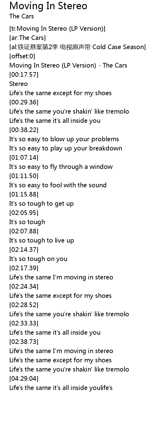 | [00:09.94] | Moving In Stereo (LP Version) - The Cars |