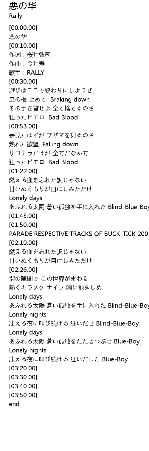 | [03:01.00] | あふれる太陽 蒼い孤独をたたきつぶせ Blue-Boy |