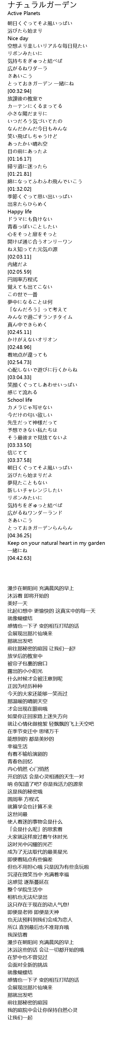 | [00:25.38] | とっておきガーデン 一緒にね |