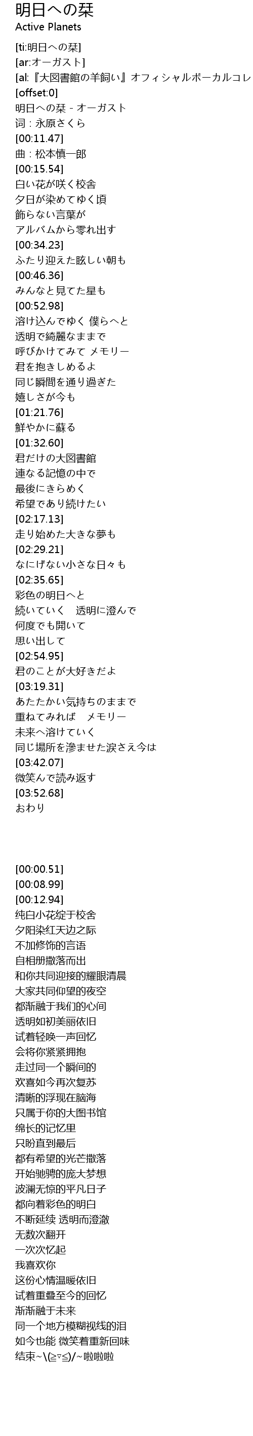 | [00:55.79] | 溶け込んでゆく 僕らへと |