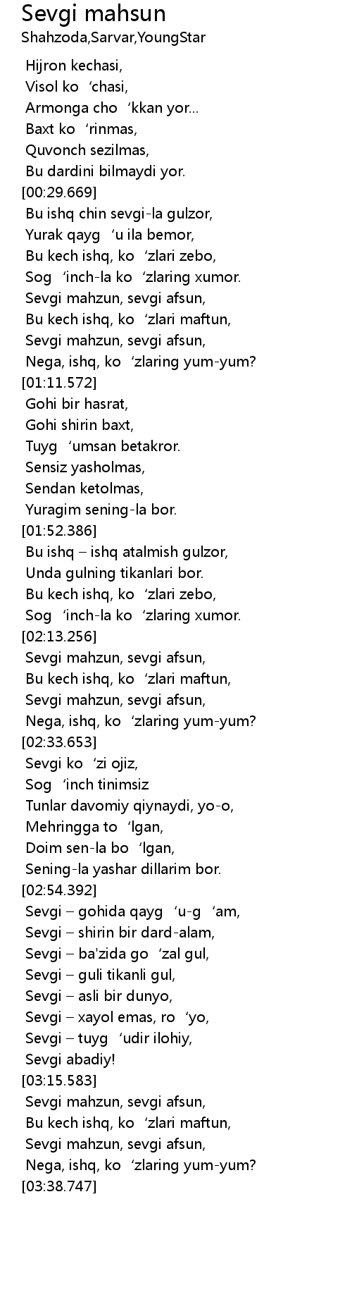 | [02:29.281] | Nega, ishq, ko' zlaring yumyum? |