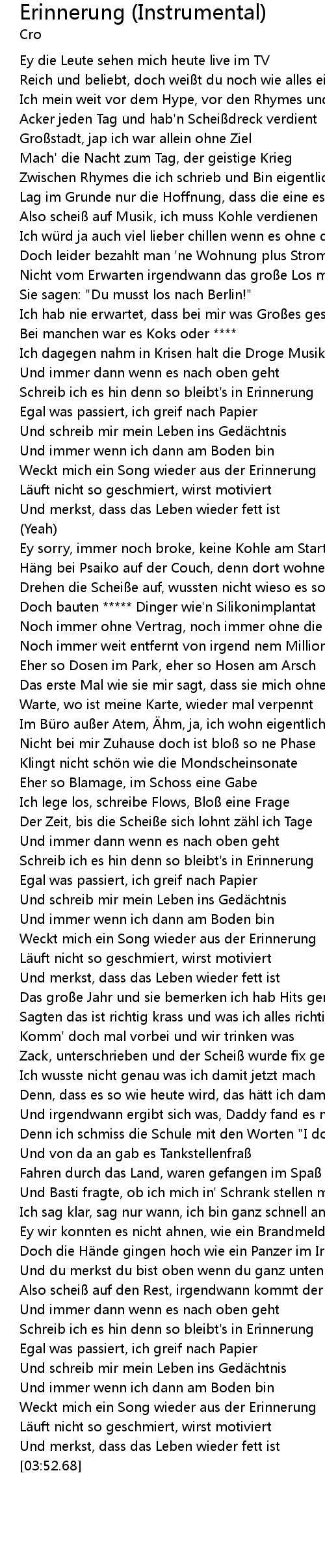 | [02:24.08] | Schreib ich es hin denn so bleibt's in Erinnerung |