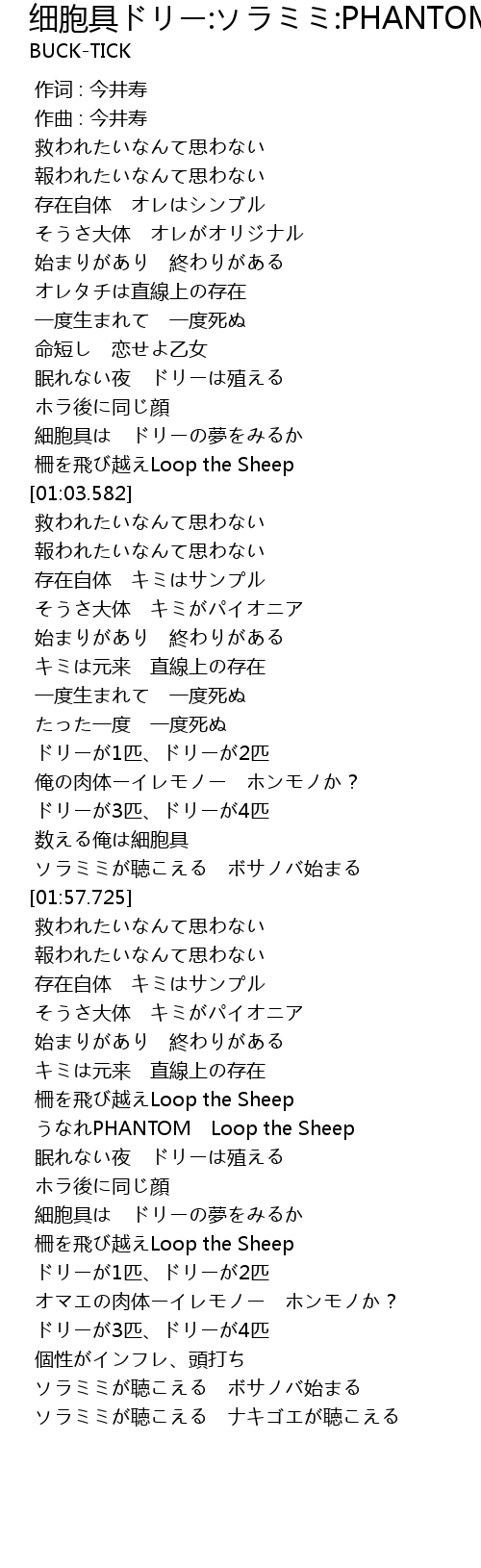 | [00:57.217] | 細胞具は ドリーの夢をみるか |