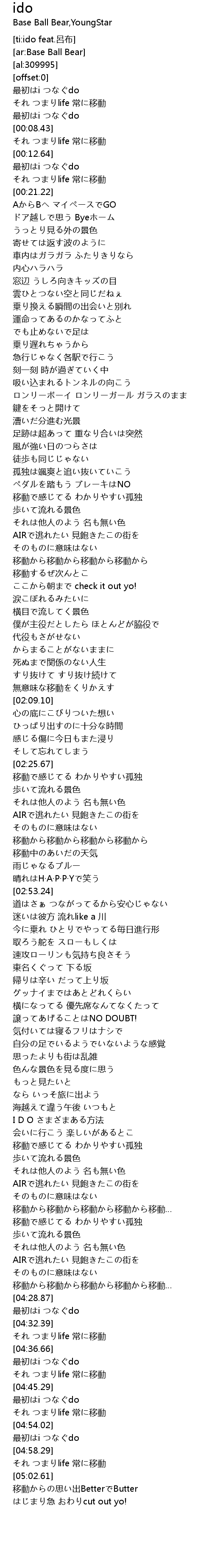 | [01:14.37] | 移動で感じてる わかりやすい孤独 |
