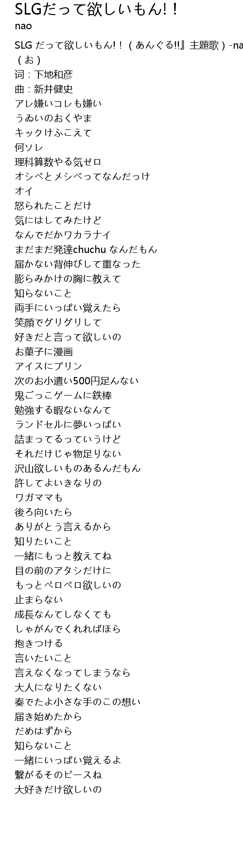 | [00:00.00] | SLG だって欲しいもん!!(あんぐる!!』主題歌)-nao (お) |