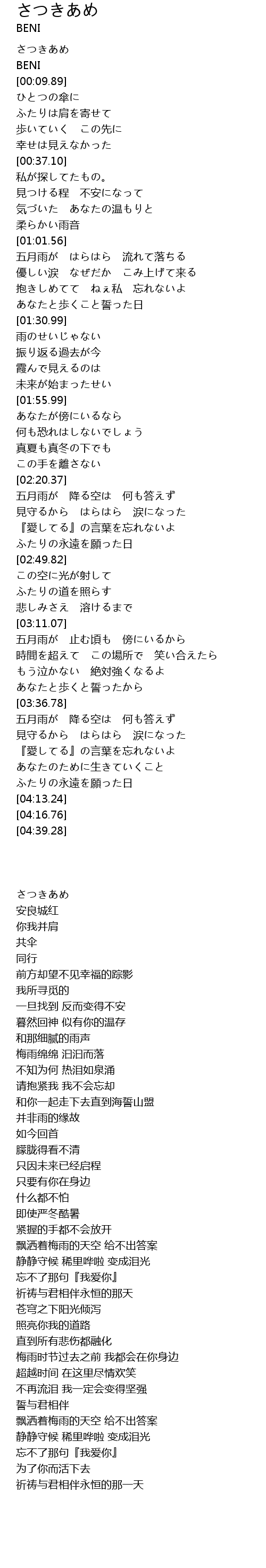 | [03:12.00] | 五月雨が 止む頃も 傍にいるから |