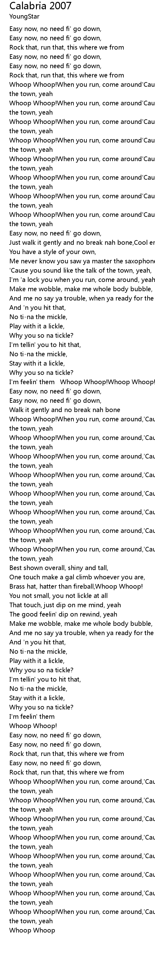 [03:17.01] Whoop Whoop!When you run, come around,'Cause I know you're the talk of the town, yeah