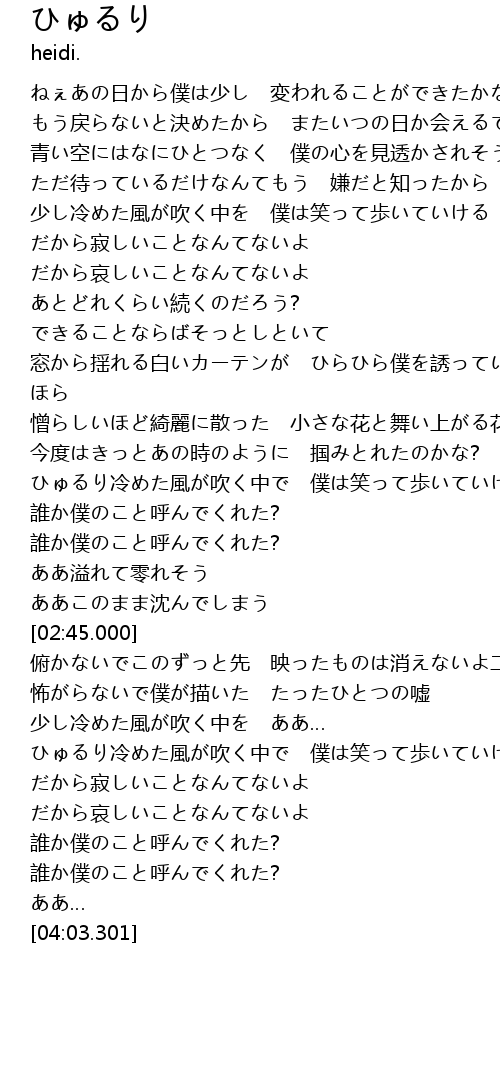 | [02:04.574] | ひゅるり冷めた風が吹く中で 僕は笑って歩いていける |