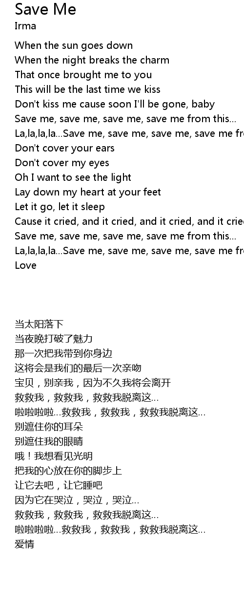 | [02:02.000] | La,la,la,la...Save me, save me, save me, save me from this... |