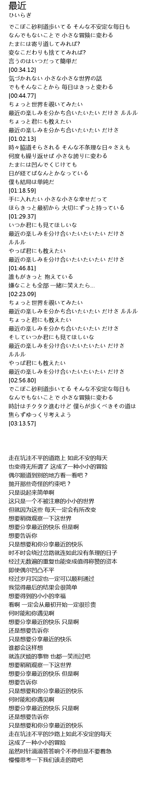 | [01:42.97] | 最近の楽しみを分け合いたいたいたい だけさ |