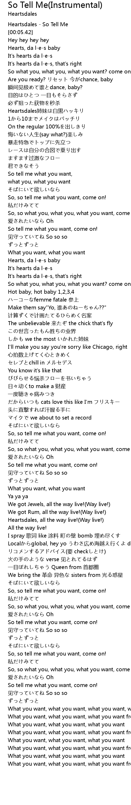 | [02:58.71] | So, so tell me what you want, come on! |