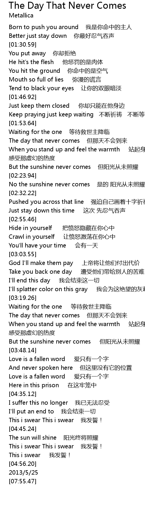 | [02:02.68] | The day that never comes 但那天不会到来 |