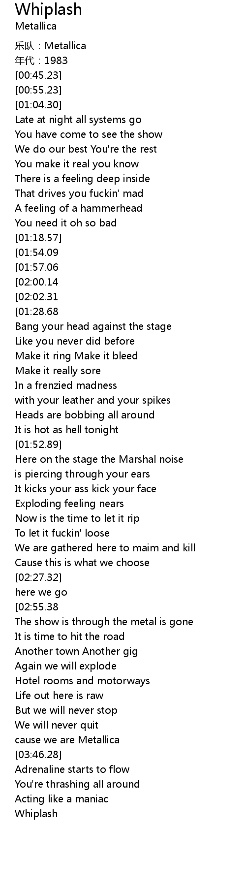 | [03:19.80][02:02.31][01:27.72] | Whiplash |