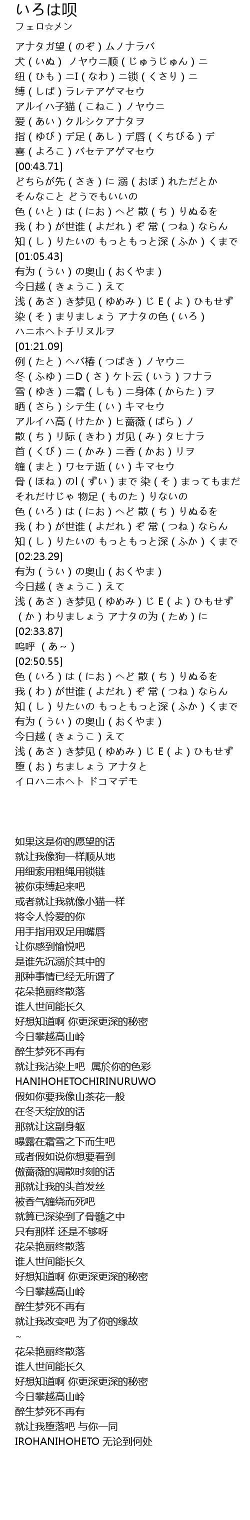 | [02:12.86] | 色(いろ)は(にお)へど 散(ち)りぬるを |
