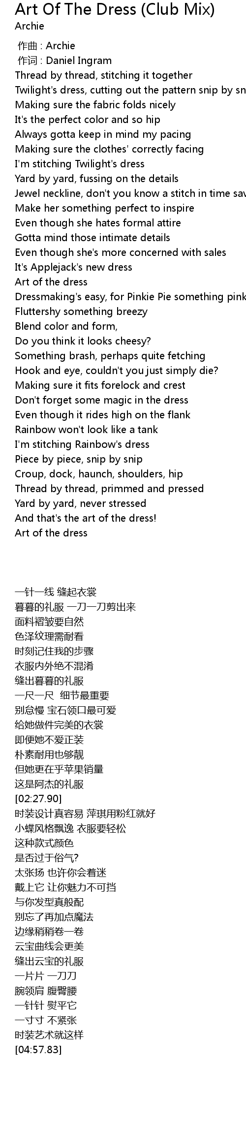 | [04:10.55] | I' m stitching Rainbow' s dress |