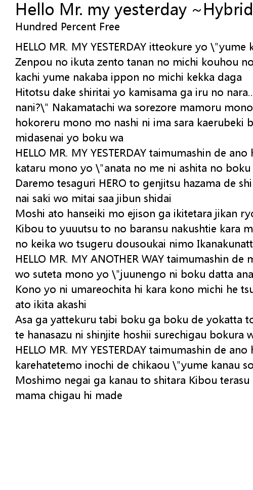 HELLO MR. MY YESTERDAY taimumashin de ano hi no boku he ima tsutaetakute Yume wo kataru mono yo \"anata no me ni ashita no boku no koto wa utsuttemasu ka?\"
