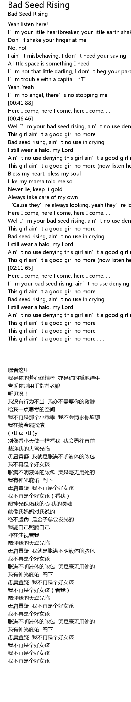 | [00:56.69] | Bad seed rising, ain' t no use in crying |