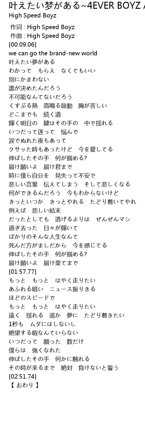 | [00:01.000] | zuo qu : High Speed Boyz |
