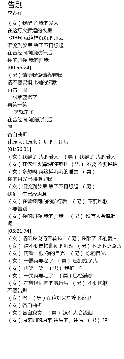 | [03:10.75] | (女)你的归你 我的归我 (男) 没有人会流泪 嗯 |