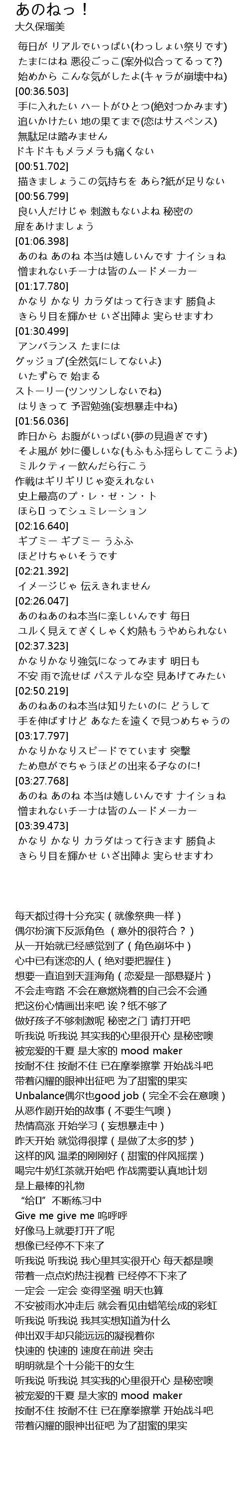 | [01:06.545] | あのね あのね 本当は嬉しいんです ナイショね |
